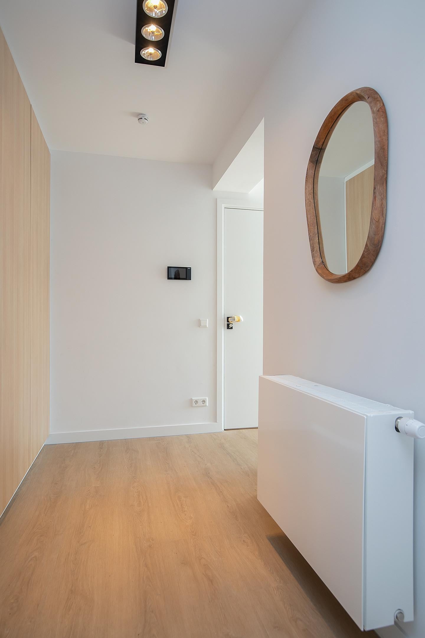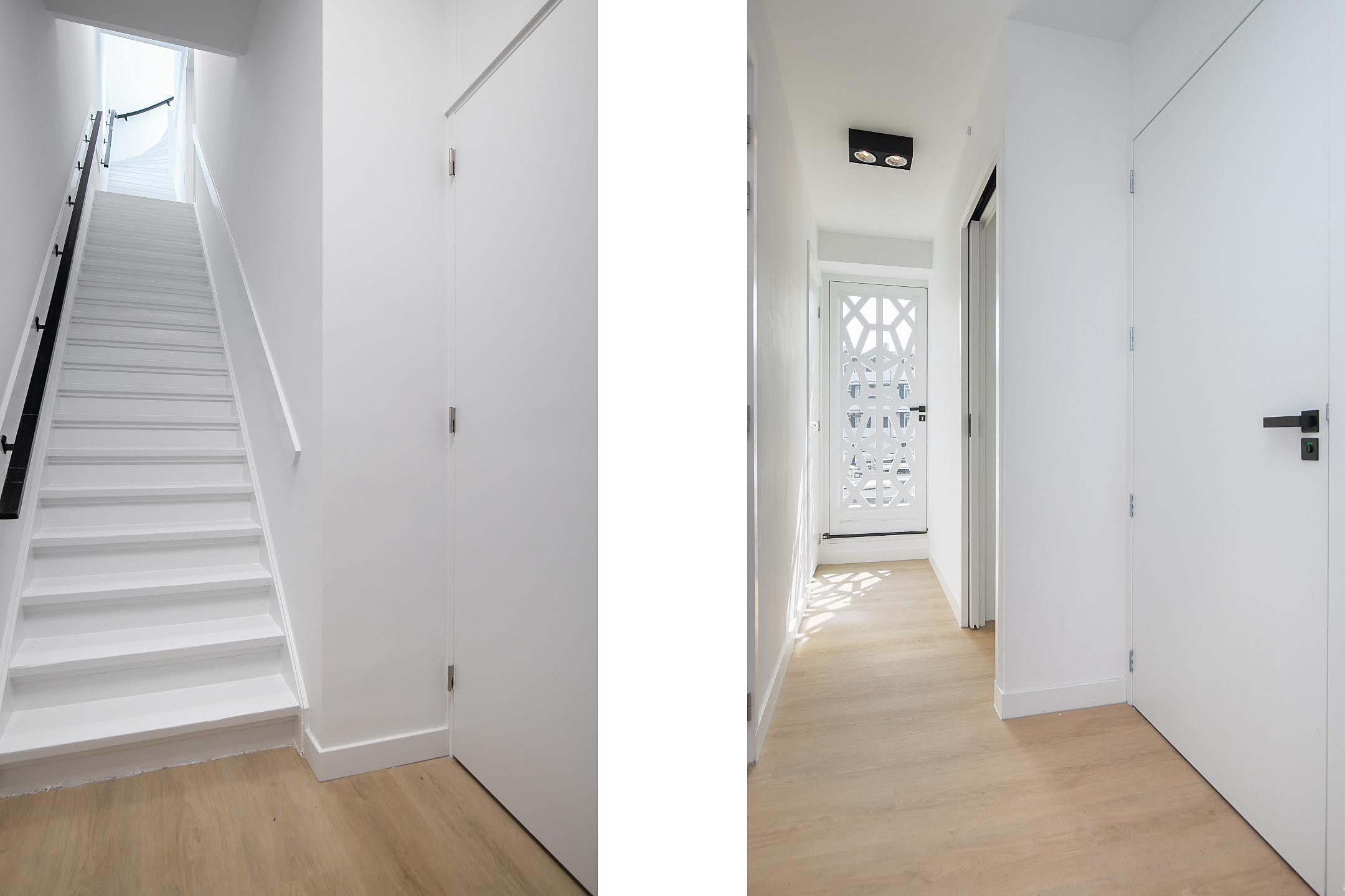 Shared entrance with doorbell panel, intercom system, and mailboxes. Hallway with access to the stairwell.