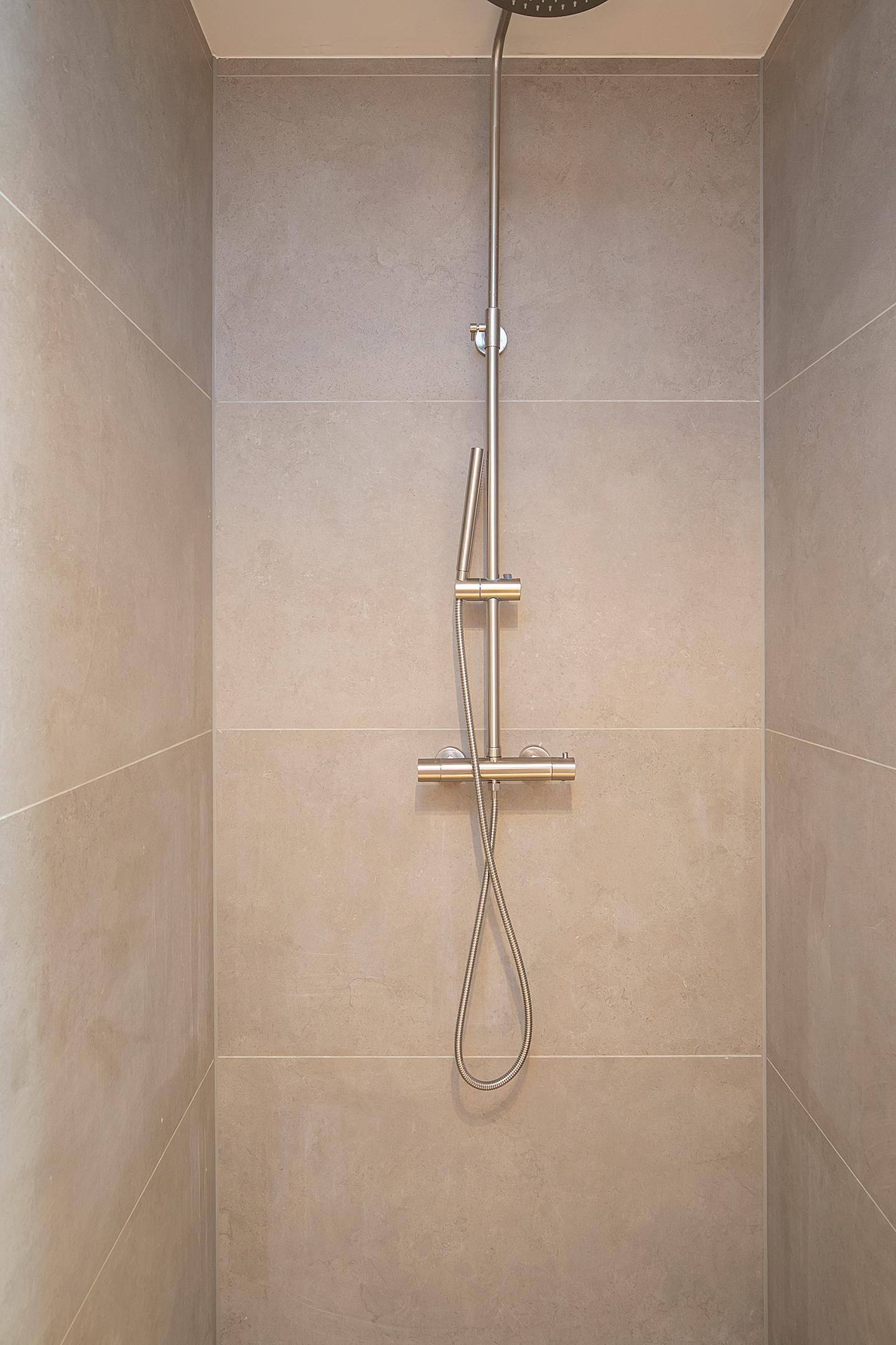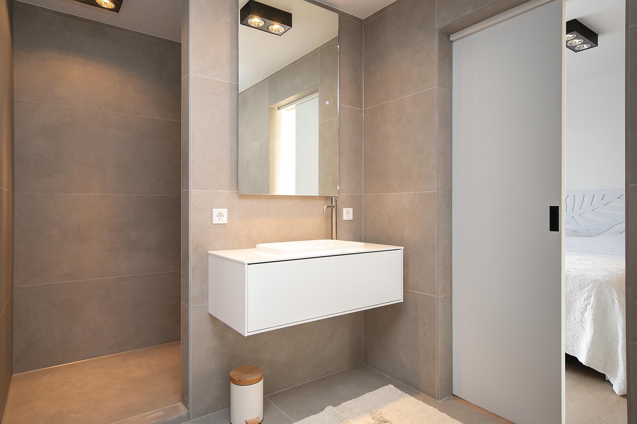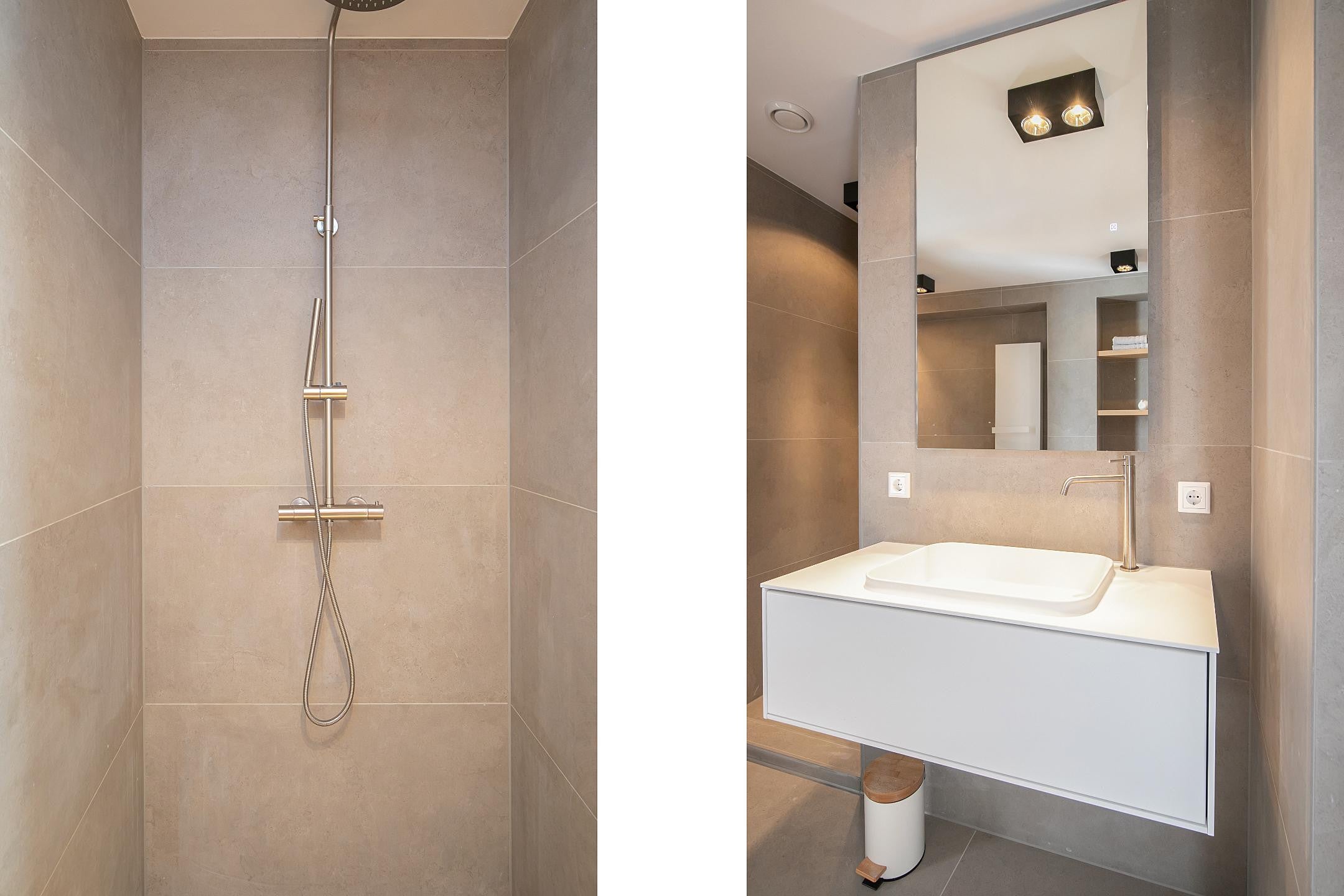 Badkamer volledig betegeld en ingericht met ruime luxe douche, en wastafel met meubel.
