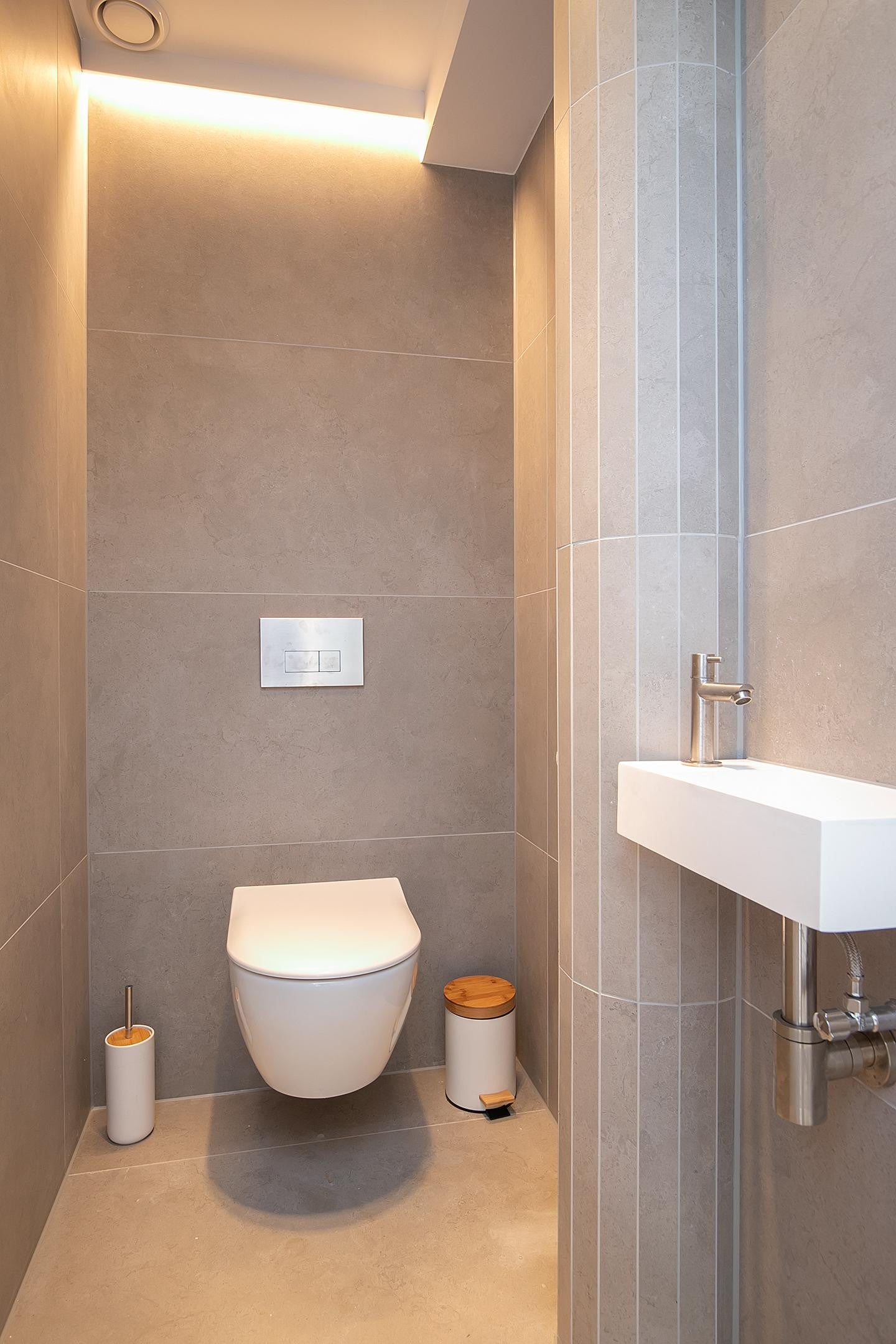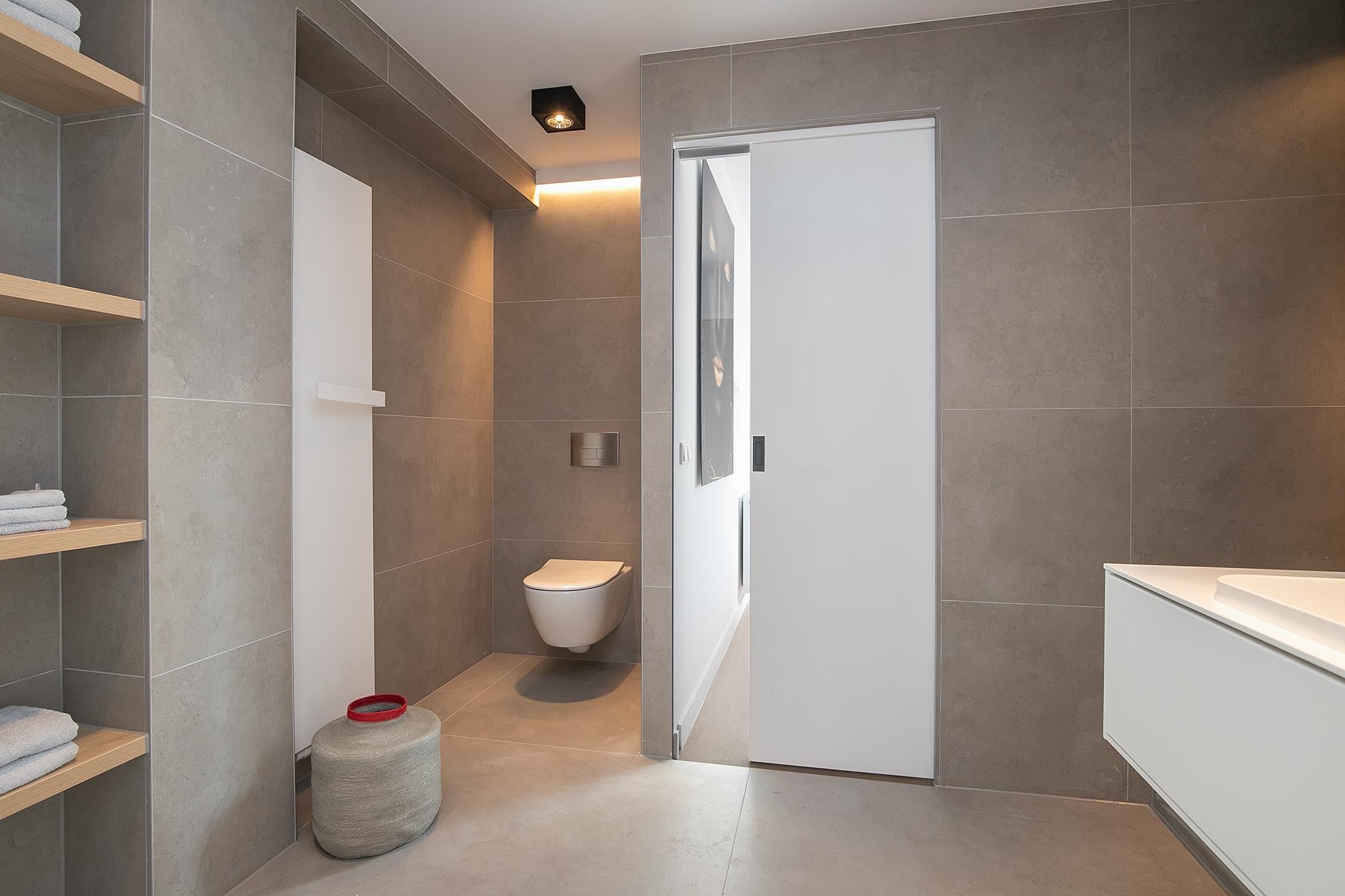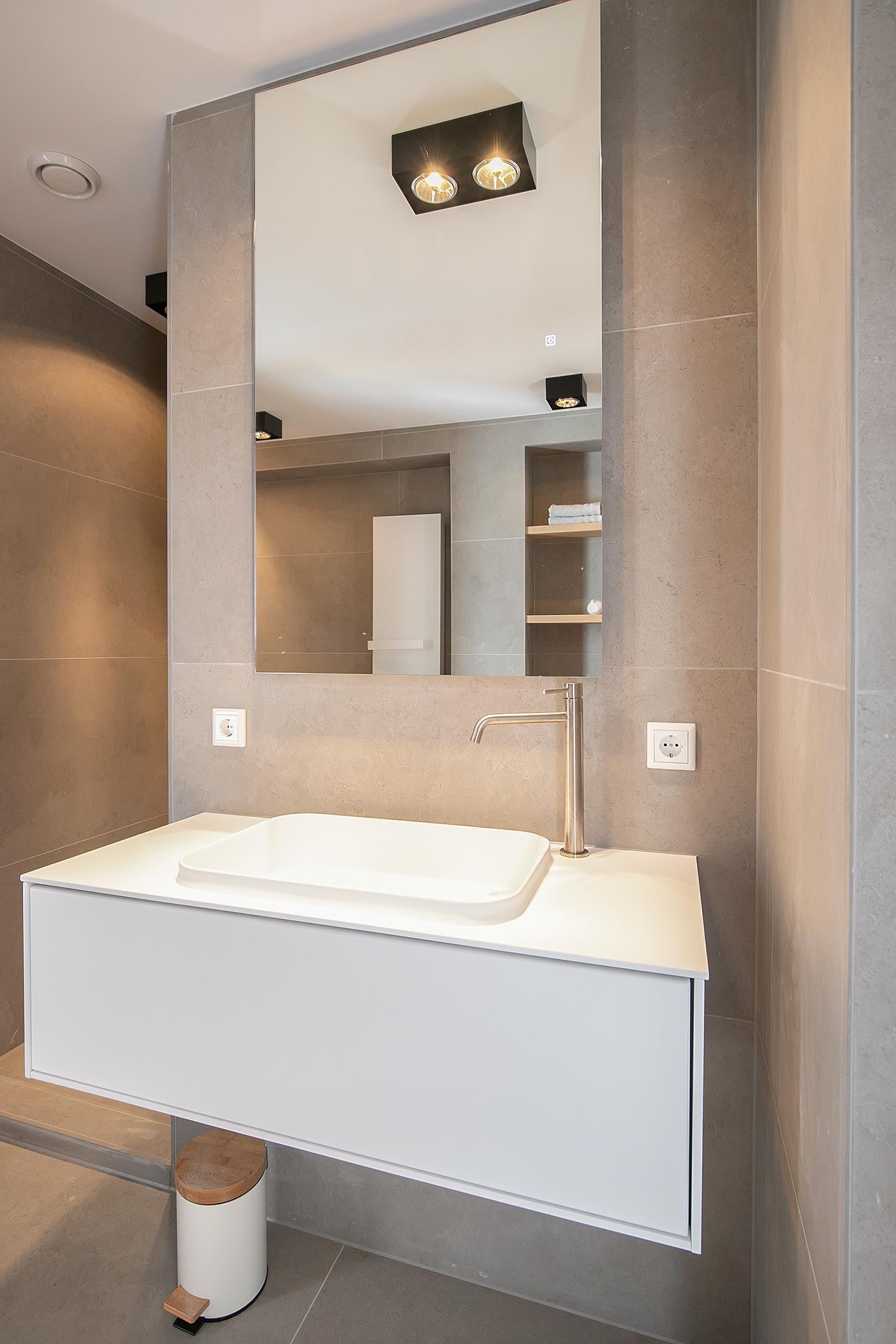 Badkamer volledig betegeld en ingericht met ruime luxe douche, en wastafel met meubel.
