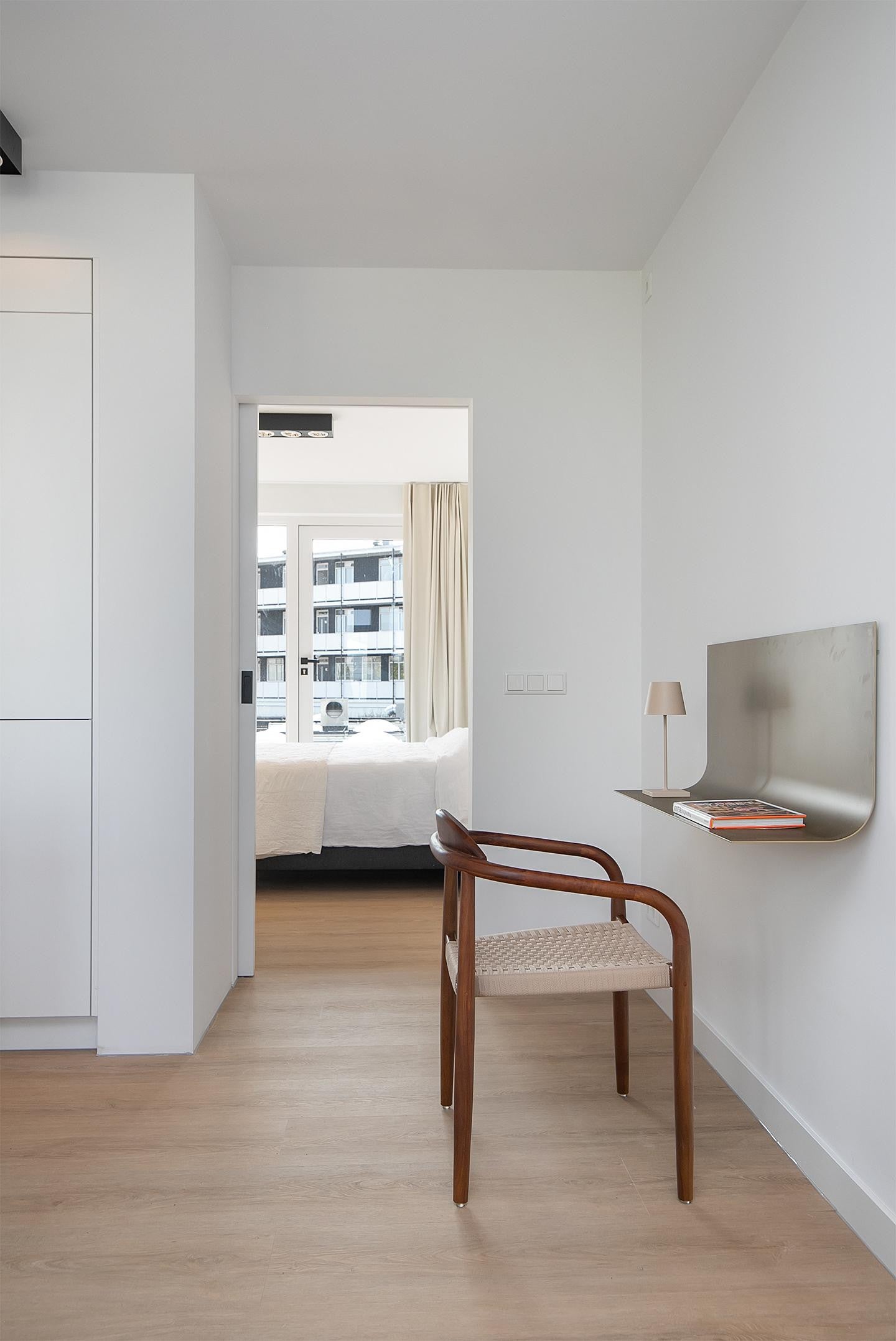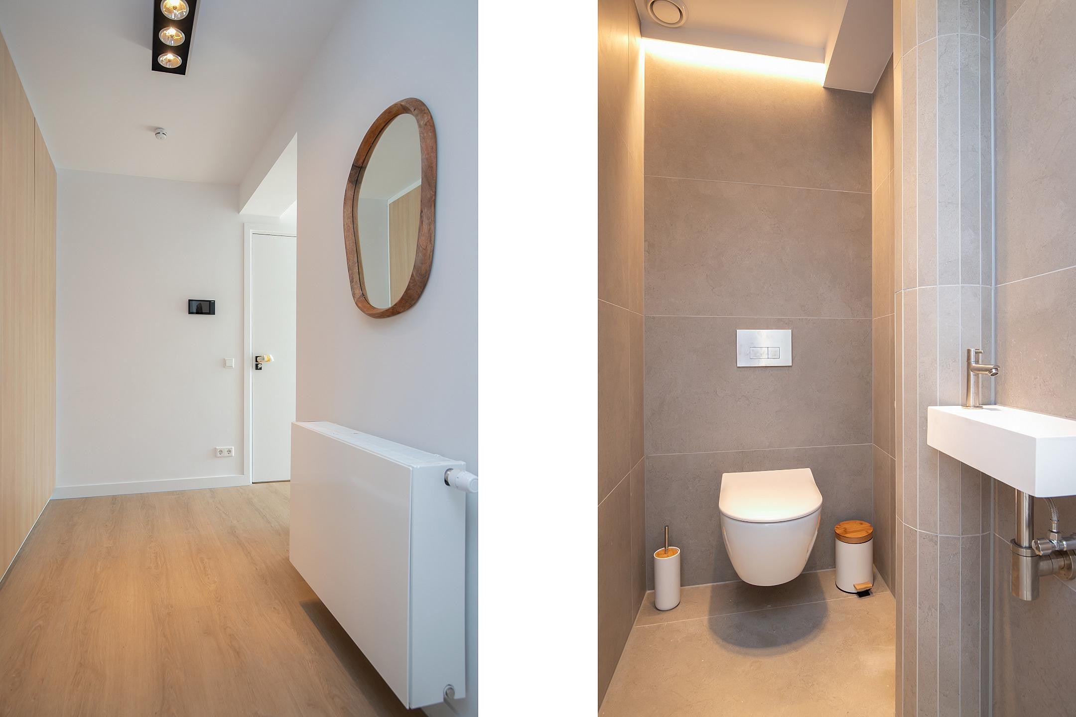 Entree hal met toegang tot betegeld toilet, c.v.- ruimte met wasmachine en droger, 1 slaapkamer, woon/eetkamer en deur naar het balkon.