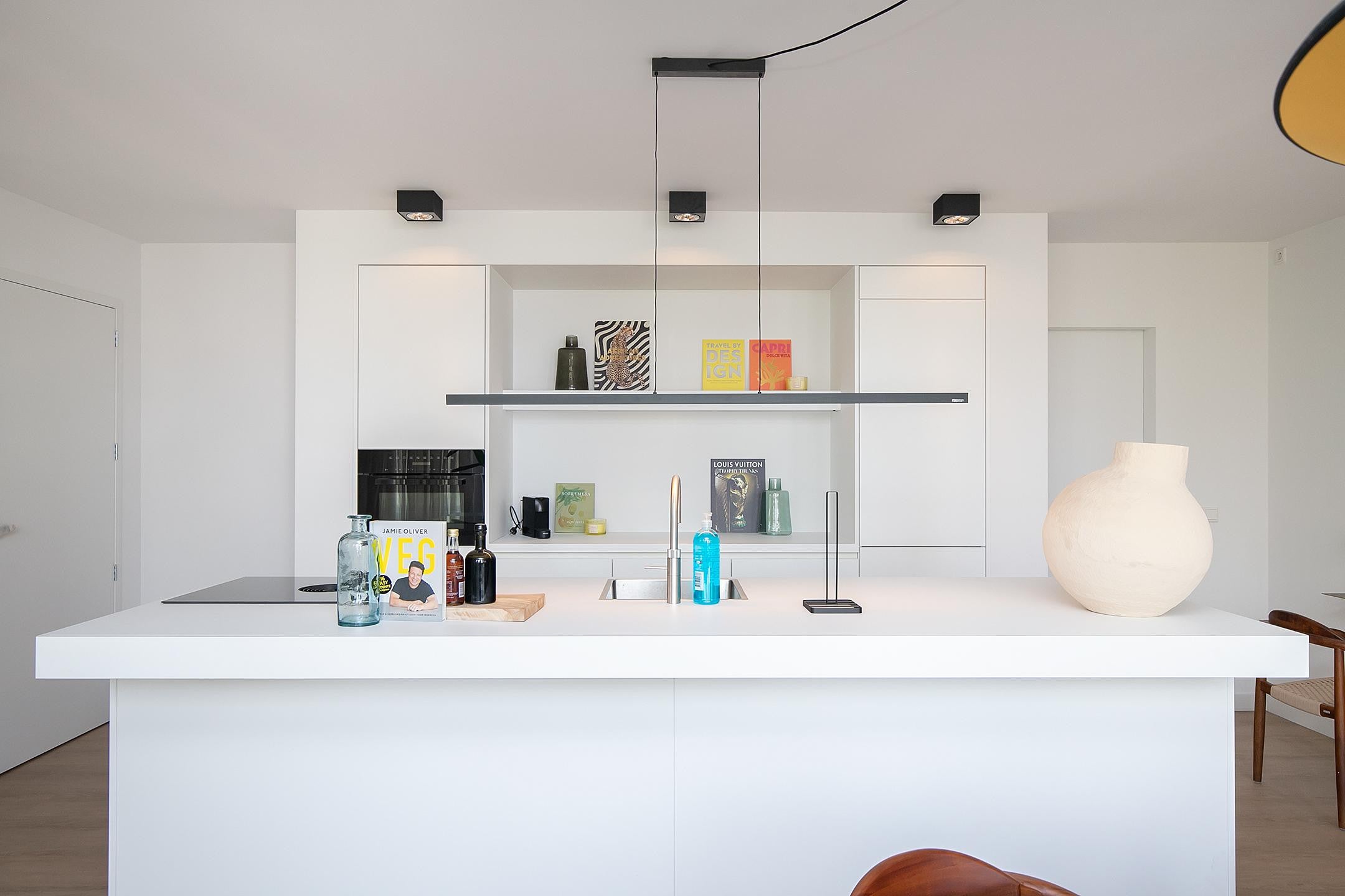 Ruime professionele keuken voorzien van inductie kookplaat met oven, ingebouwde afzuigkap, koelkast en werk eiland met opbergruimte.