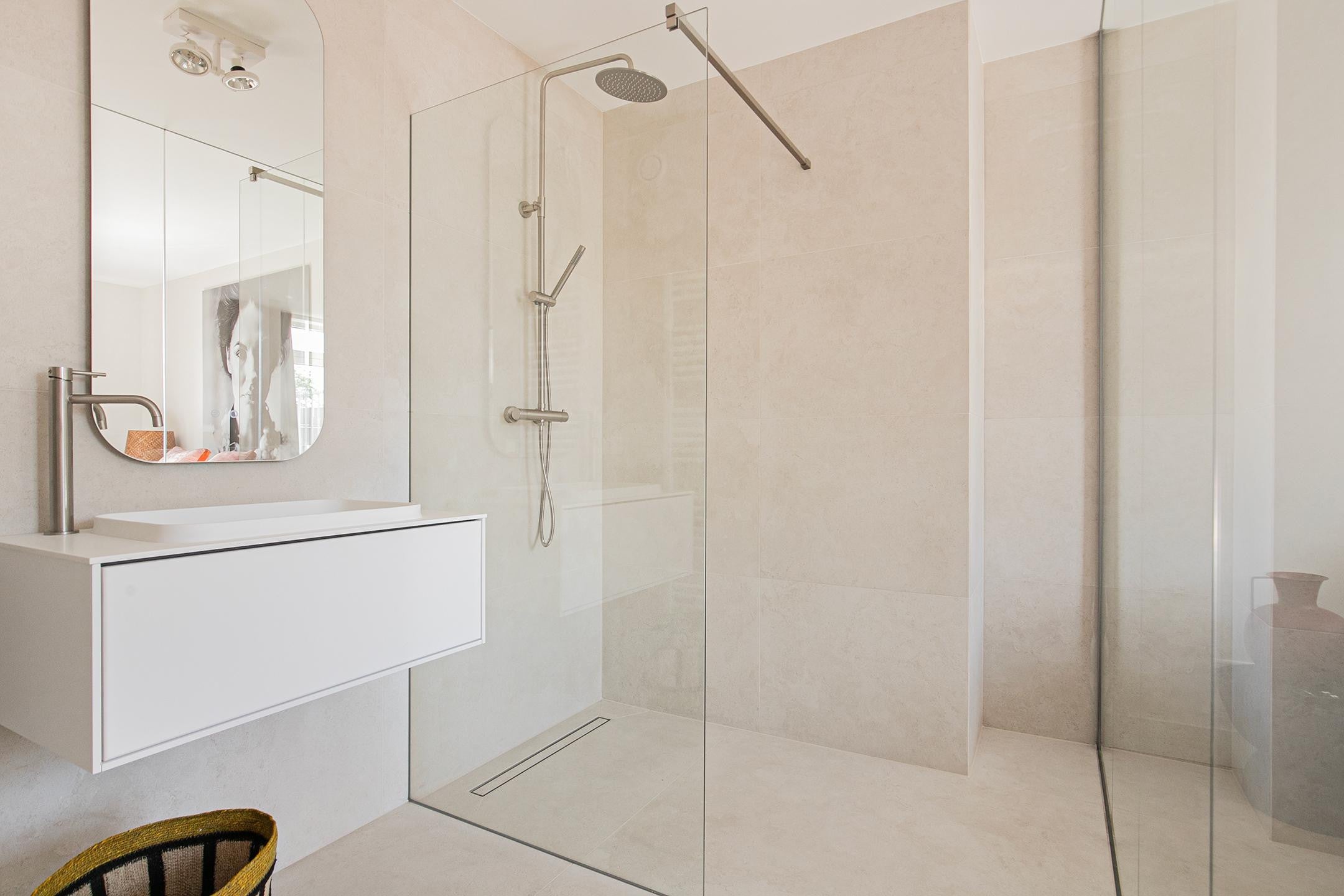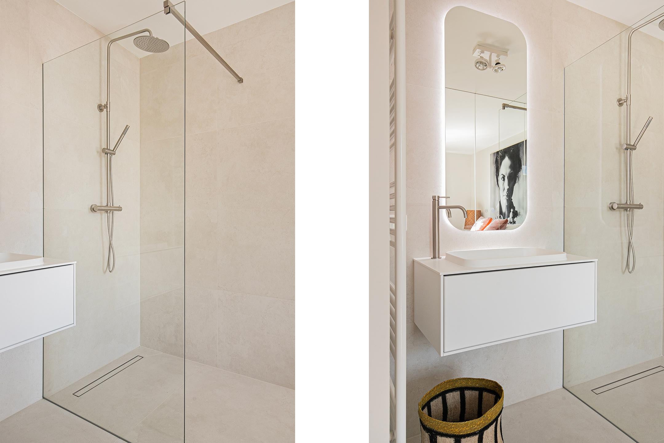 Badkamer met inkoopdouche en badmeubel/wastafel.