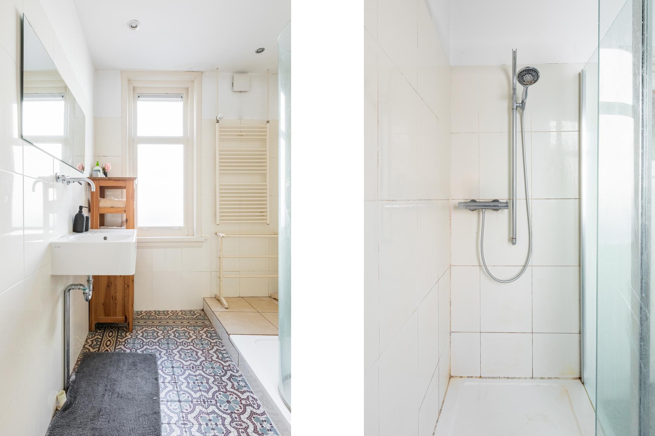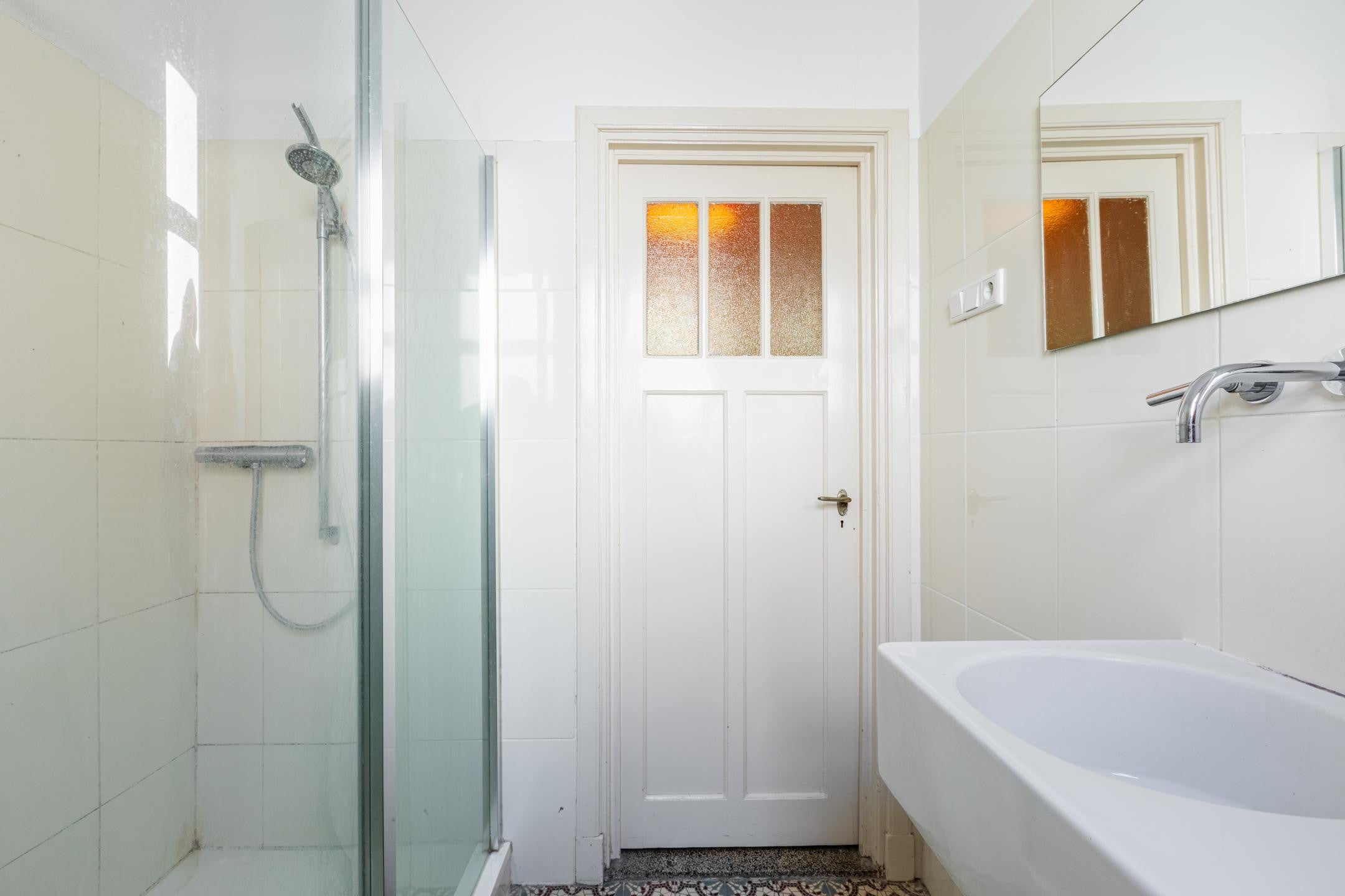 De badkamer is voorzien van een inloopdouche en wastafel, en daarnaast is er een separaat toilet aanwezig.